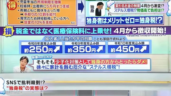 独身税とは、“子ども・子育て支援金制度”の通称。児童手当の所得制限の撤廃、妊娠・出産時に5万円ずつ支給、両親ともに育児休暇を取得した際に手取りの10割を給付、育児のために時短勤務している労働者に賃金の10%を支給など、子育て世帯にはメリットがある。その財源は原則として、公的医療保険に加入する全世代や企業からの徴収なため、独身者はメリットがないとして、SNSで批判が続出した。