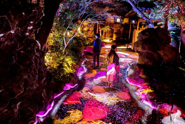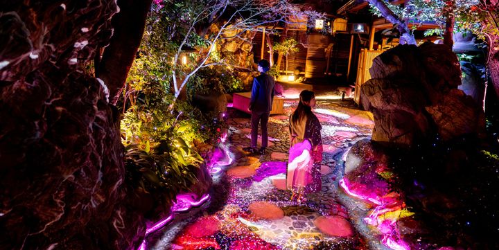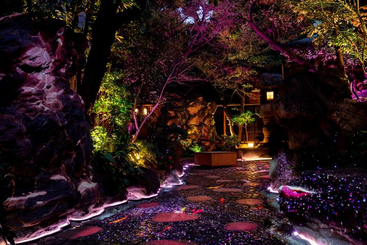 門をくぐると、錦鯉が舞う池が光で映し出され、音の演出と共に空間を優しく包み込みます。光は池の揺らめきや鯉の気配を思わせる軌跡として現れながら、人の動きに呼応して変化していくという現代的な演出に。こちらは、2027年12月31日までの期間限定で展開される予定です。