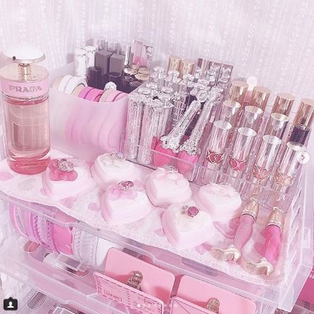 5.小物入れを全てピンクに統一した化粧棚!