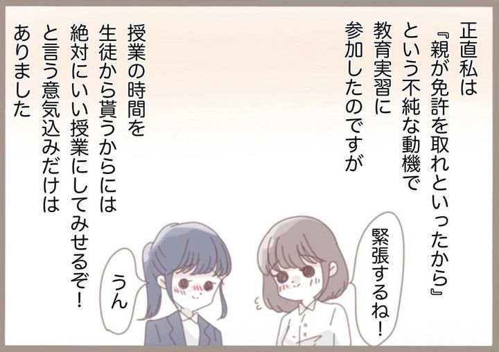 作者が母校の女子校で教育実習をしたときの話。指導担当になったのは、在学時から在籍していた女性教師だった。当時はごく普通の先生に思えていたが、じつは自分のやり方以外を認めない、パワハラ気質のこじらせ教員だった。連日、無理難題を押し付けられ、作者はへとへとに。はたして最後までやり遂げられるのだろうか……。