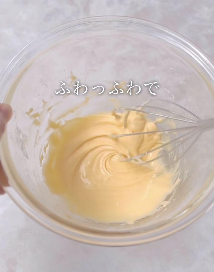 ②で作った生地ベースに、メレンゲをひとすくい入れ、ホイッパーでしっかり混ぜ合わせます。