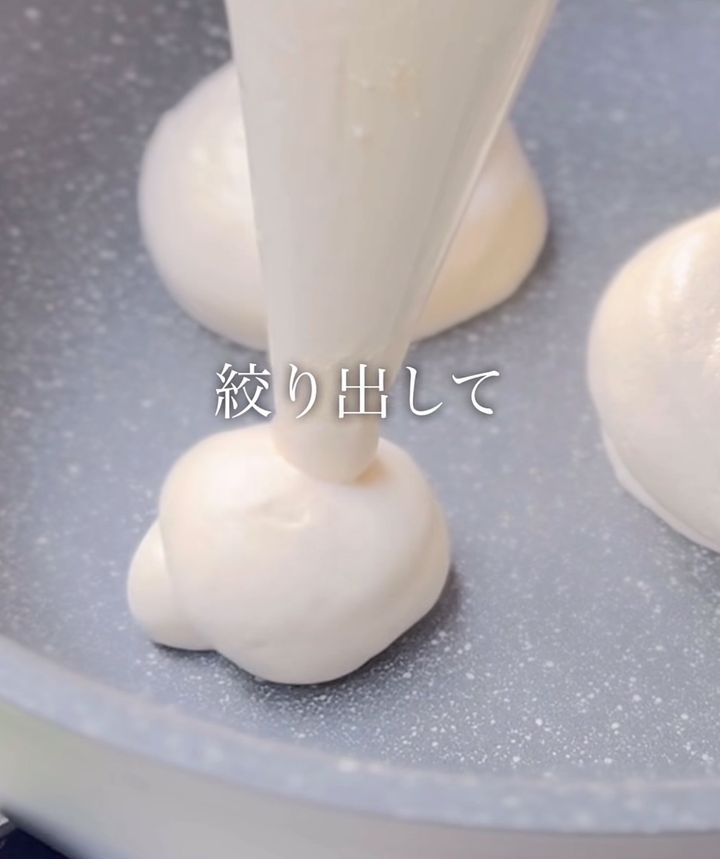絞り袋を使ってフライパンへ。高さを出すのがスフレ感を出す秘訣!