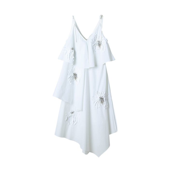クリーンな白ドレスを大輪の花でモードに飾り付け
