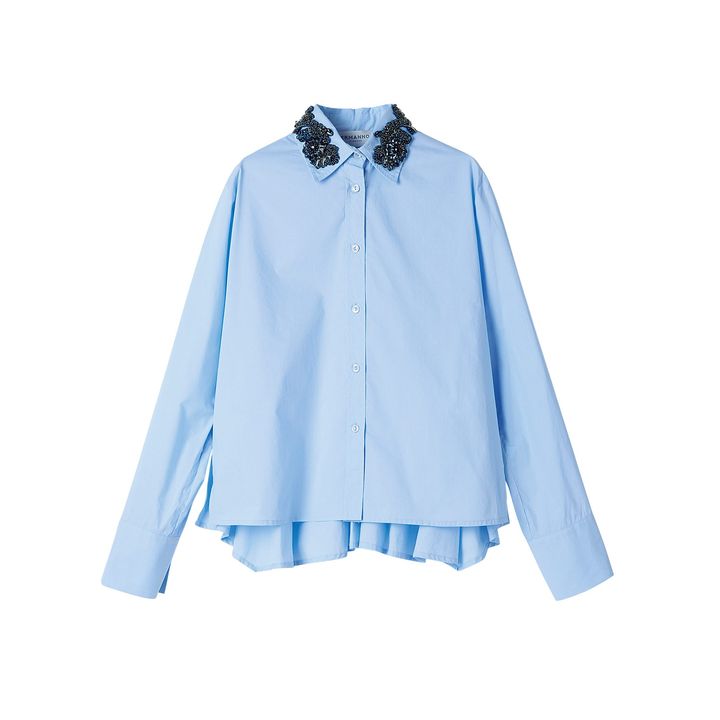 デイリーなワードローブの代表格であるブルーシャツの襟元に、ダークカラーのフラワービジューを添えて。どこかゴシックなスパイスを利かせた、ひねりのある一枚。