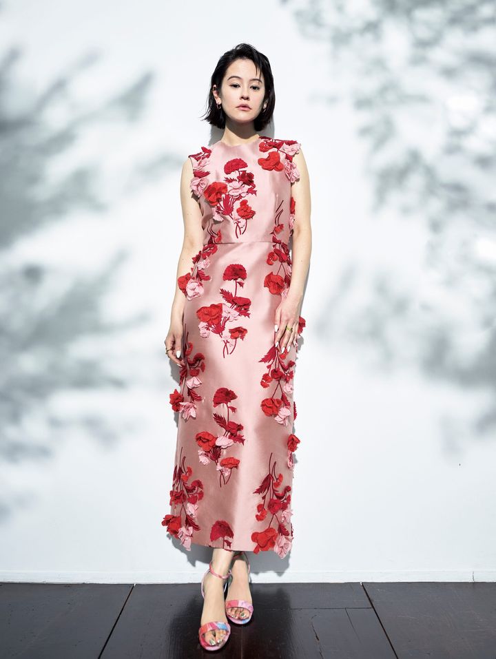 ワンピース¥741,400(アーデム/メゾン・ディセット) 靴¥159,500(クリスチャン ルブタン/クリスチャン ルブタン ジャパン) ピアス¥120,750 リング〈左手〉¥112,060 〈右手〉¥243,600(すべてベア ボンジャスカ/ベア ボンジャスカ カスタマーケア)