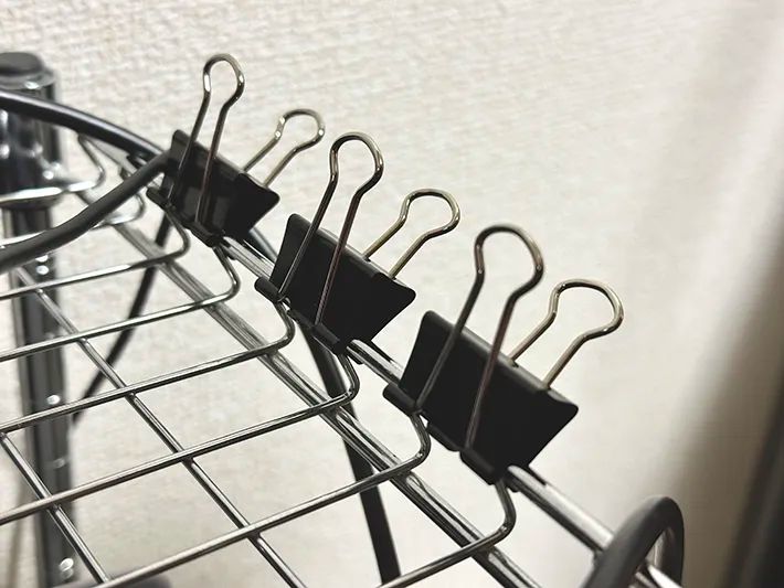まず、ダブルクリップを棚の端に挟みます。