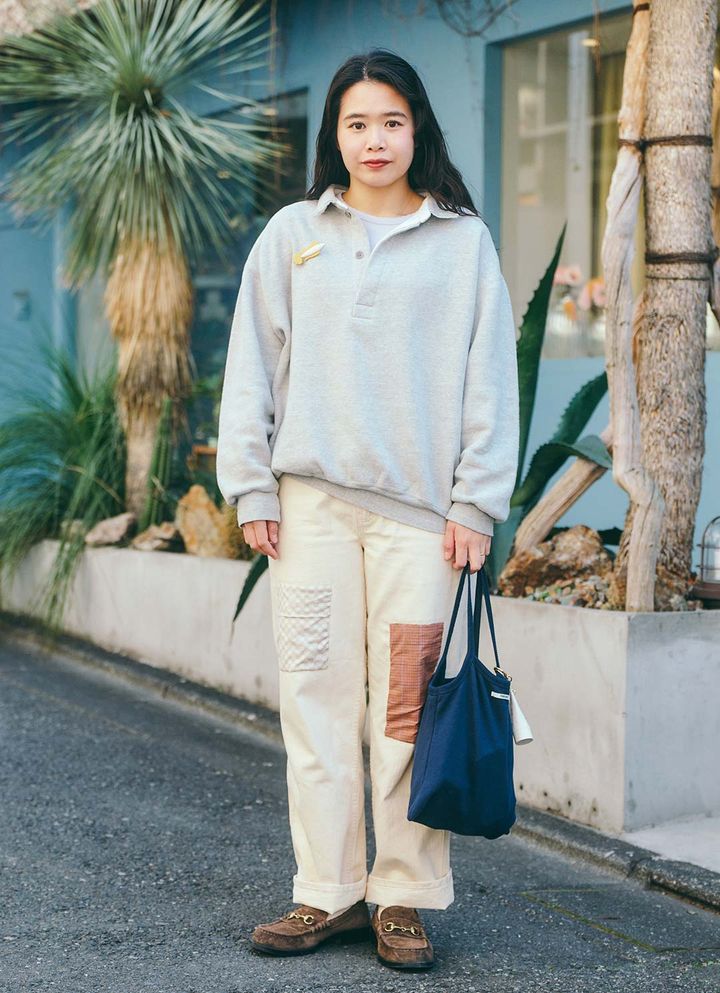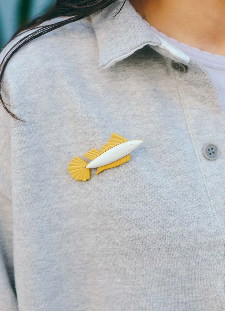グレースウェットの胸もとに添えたヴィンテージブローチは、『メイデンズショップ』で購入。魚モチーフのイエローが春らしい!