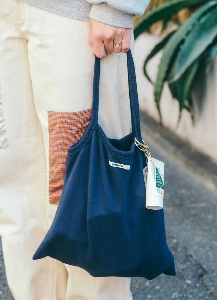 韓国で購入したトートバッグはインナーのようでユニーク! ネイビーをセレクトして、コーデをぐっと引き締めて。