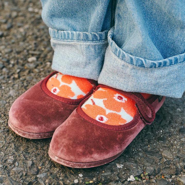 ウニッコ柄ソックスとベロアシューズの組み合わせがキュート! 足元に暖色を集めて、あたたかな季節感をチャージ♪