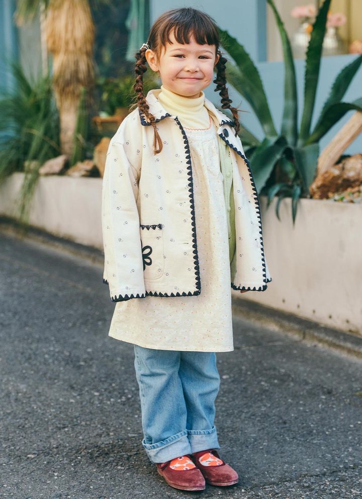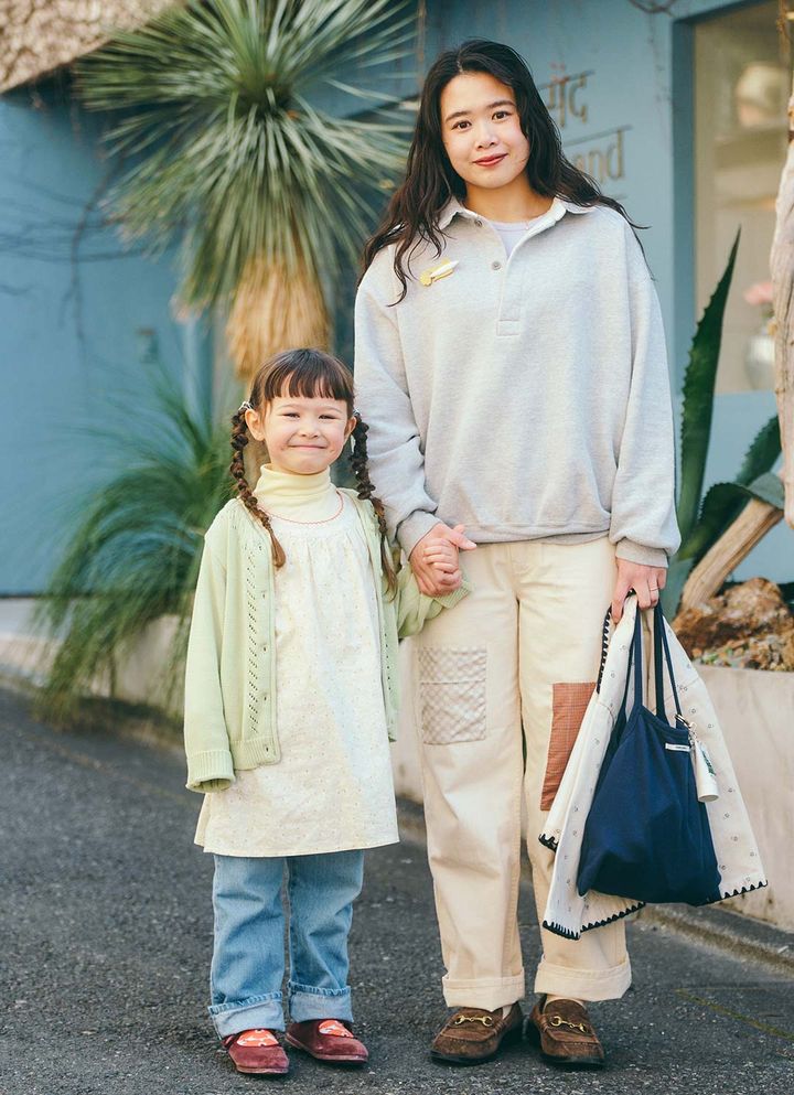 やわらかい明るめトーンで揃えた親子コーデは、全体がぼやけないようネイビーカラーで引き締めたのがポイント。リメイクした『無印良品』のボトムスやサカナのブローチなど、ミニマムなスタイルのなかに遊び心が詰まった、唯一無二のコーデは必見!