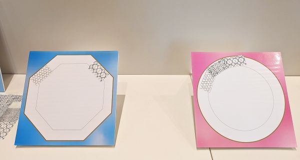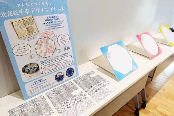 3階ホワイエに置かれたお皿型のパネルに、出品中の絵手本『新形小紋帳』にある北斎がお手本として描いた文様のシールを貼り、観覧に訪れたみんなでお皿のデザインを完成させるイベントです。完成したお皿のデザインは、AIの技術で画像生成し、ピックアップして公式SNSで紹介されるそうです。 どなたでも自由に参加できます。観覧の記念に参加してみてはいかがでしょう。