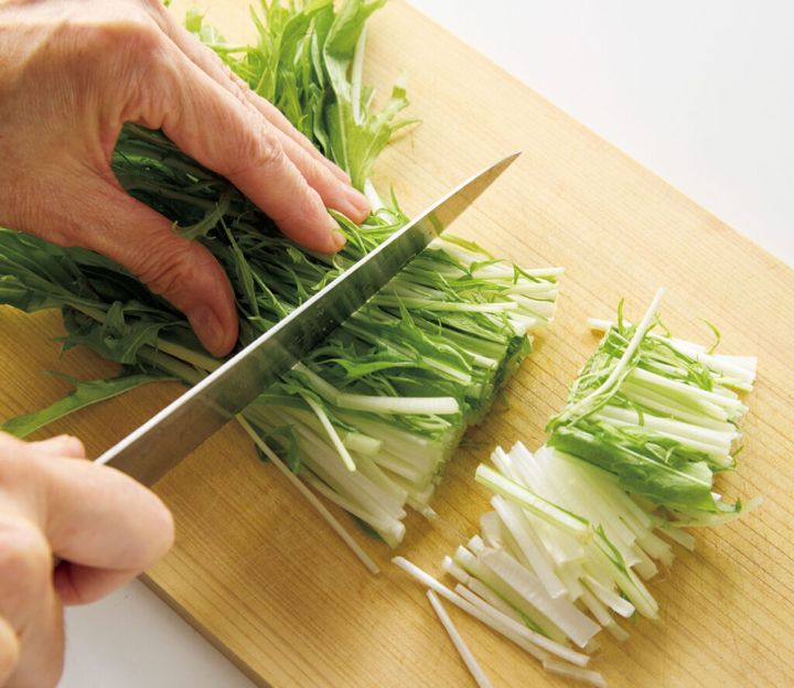 (1)水菜は長さ3cmに切る。油揚げはペーパータオルで押さえて余分な油を取り、縦半分に切ってから、横になるべく細いせん切りにする。