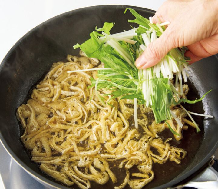 (2)フライパンに煮汁を入れて中火で煮立て、油揚げを入れて1~2分煮る。水菜を加えてさらに2分ほど煮る。