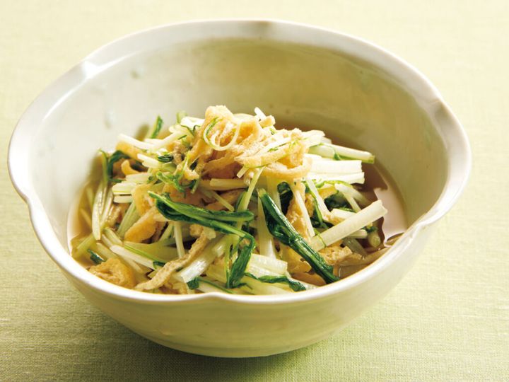 水菜は短く切るのが、食感をよくするポイント。油揚げのコクが加わり、ほっとする味わいの一品です。