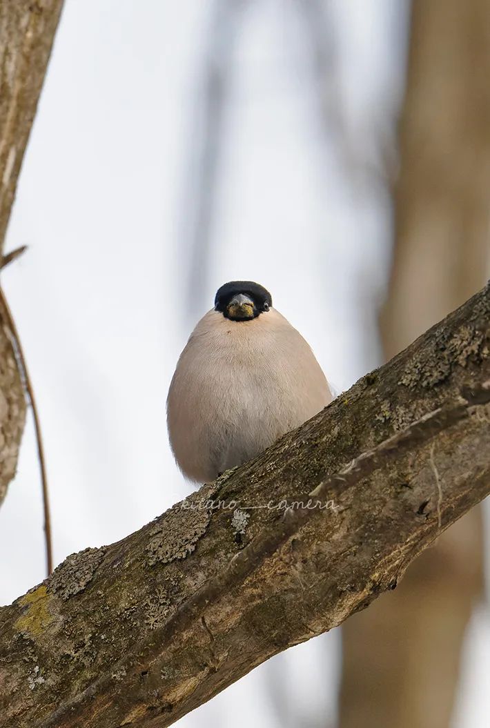ウソは、スズメより少し大きく、オスは頬から喉元にかけてきれいなピンク色をしています。写真の子は、胸から腹が全体的に淡い灰色なので、メスなのでしょう。