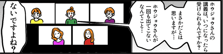 オンライン画面に映るほかの受講者たちは、冷めた表情になっています。もはや講義に期待する気配はなく、全体がゆるい諦めムードに包まれているように見えました。