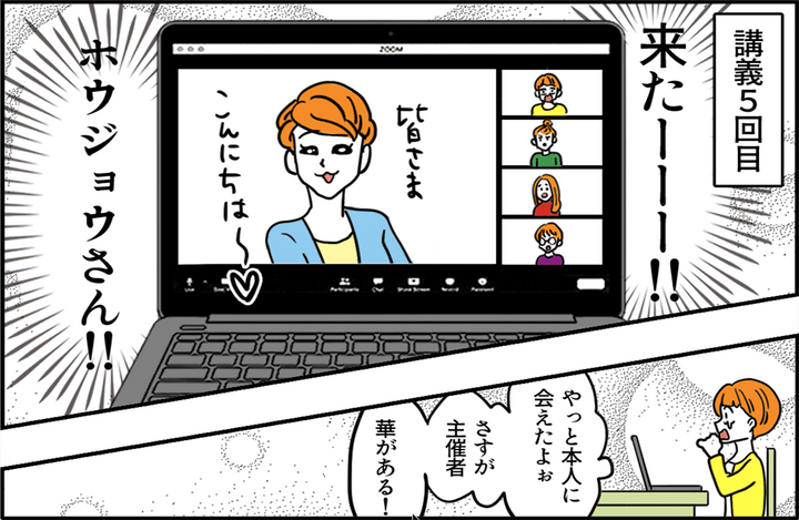講義の5回目にして、ホウジョウさんがようやく登場しました。圧倒的な話術に引き込まれたものの、身になる実践的な内容はまったくありませんでした。受講生たちをさまざまな角度から「頑張りましょう!」と励ましていただけだったのです。