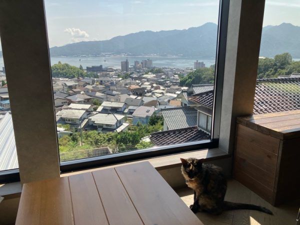 次の部屋には猫達が思い思いにくつろいでいます。大きな窓から日の光降り注ぐ明るいリビング。宮島が綺麗に見えます。高台から広々とした絶景。