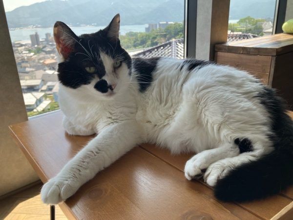 今日は、窓辺から朝夕美しい宮島が見えるシニア猫専門保護猫カフェShhh…(シー)に来ています。