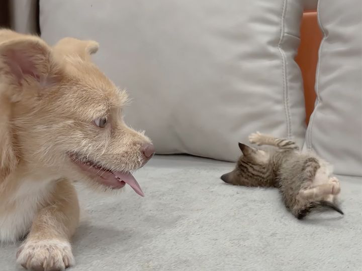 3. とっても小さな子猫を発見! 小さすぎて、犬さんもどう接したらいいのか困惑?