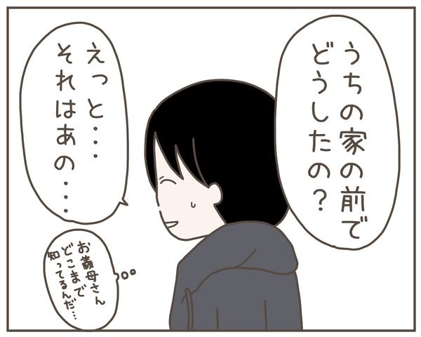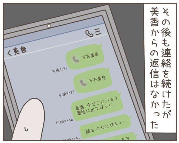 妻とまったく連絡が取れないため、夫は義実家へと向かいます。偶然、鉢合わせた義母に話を聞こうとするも、どうやら妻はここには帰っていないようで…?