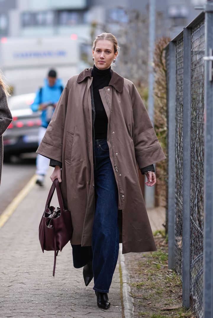 ブラックのハイネックニットとデニムを合わせた、秋冬定番のコーディネート。ブラックではなく、ブラウンのビッグシルエットコートを合わせて個性的に。ボルドーのトートバッグが、気負わないスタイルを実現してくれます。