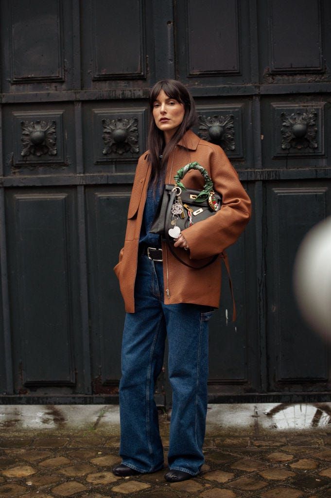 シャツとパンツのオールデニムに黒のベルトとシューズを合わせ、すとんとしたシルエットのジャケットを羽織ってマニッシュに決めて。ハンドルにスカーフを巻いて、キーホルダーで飾ったバッグが遊び心たっぷり。