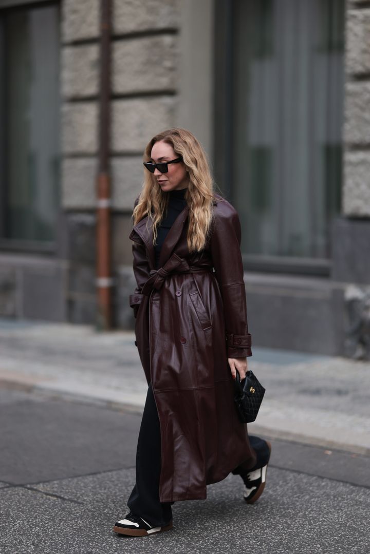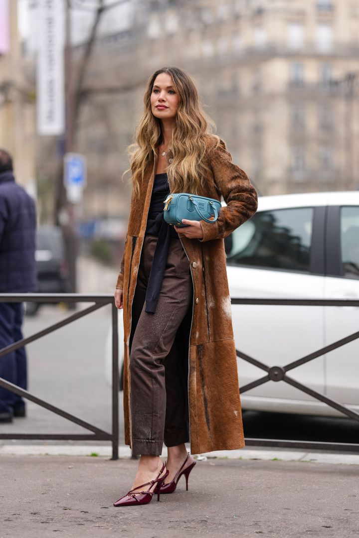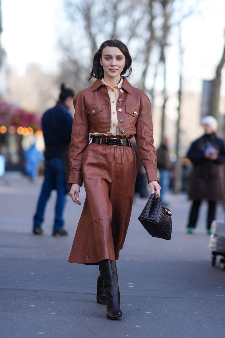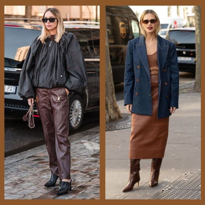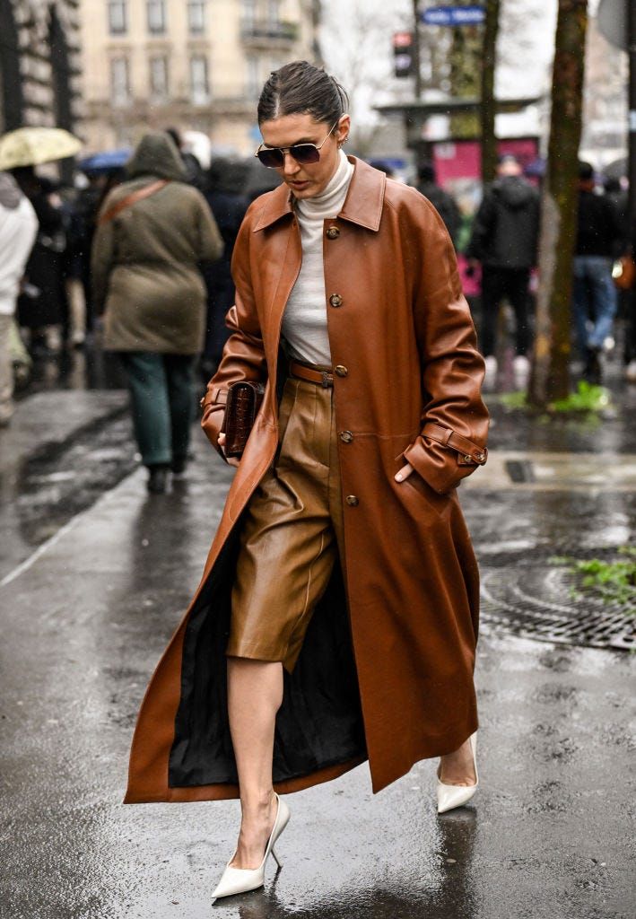 レザータイプのハーフパンツは、軽やかさとエレガントさを兼ね備え、まさに大人にぴったり! コートとパンツは明るい茶色を選び、濃いブラウンのバッグを持つことで絶妙なグラデーションが完成します。