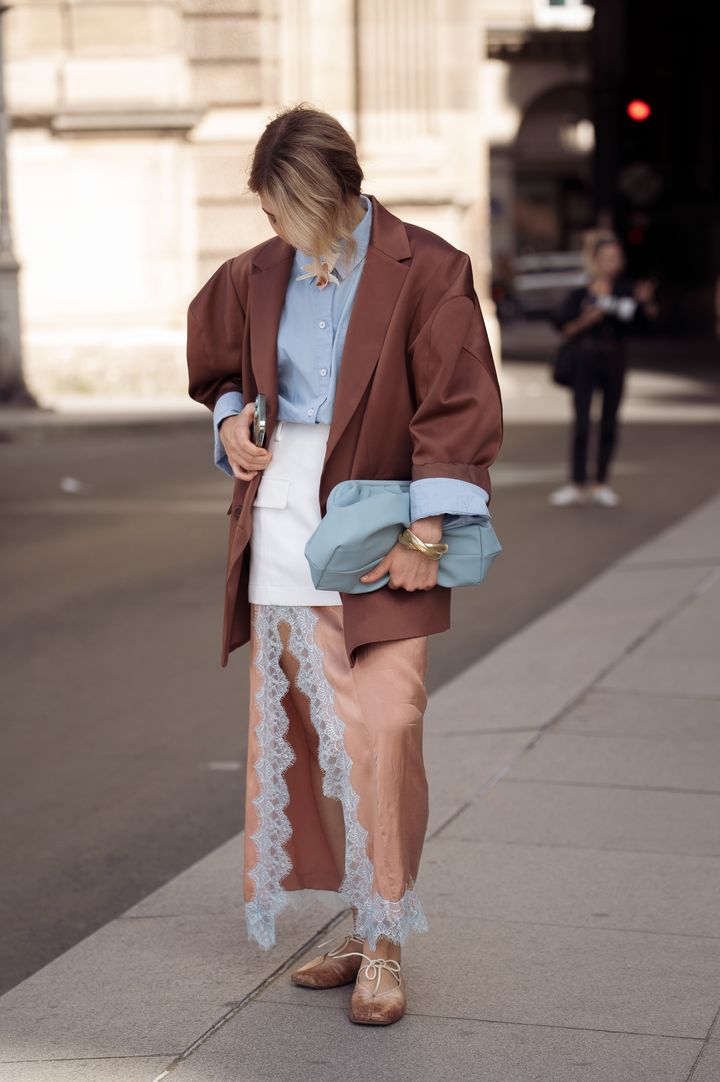 清潔感あふれるブルーシャツの着こなし。ビッグシルエットなブラウンジャケットを羽織るだけで、着こなしが一気に旬顔に。さらにレーシーなドレスを重ねてニュアンスアップ。