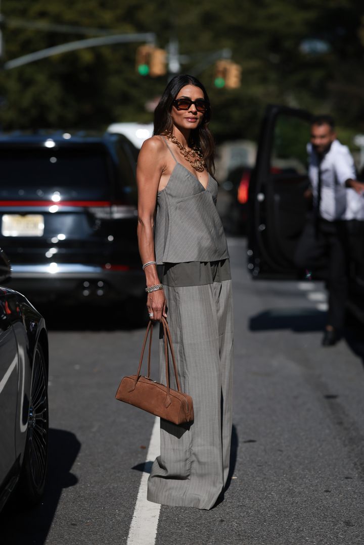 開放感のあるキャミソールコーデは、シックなカラーパレットが大人の正解。しなやかな生地のセットアップに、トレンド感のあるスエードバッグがエレガントに映えます。