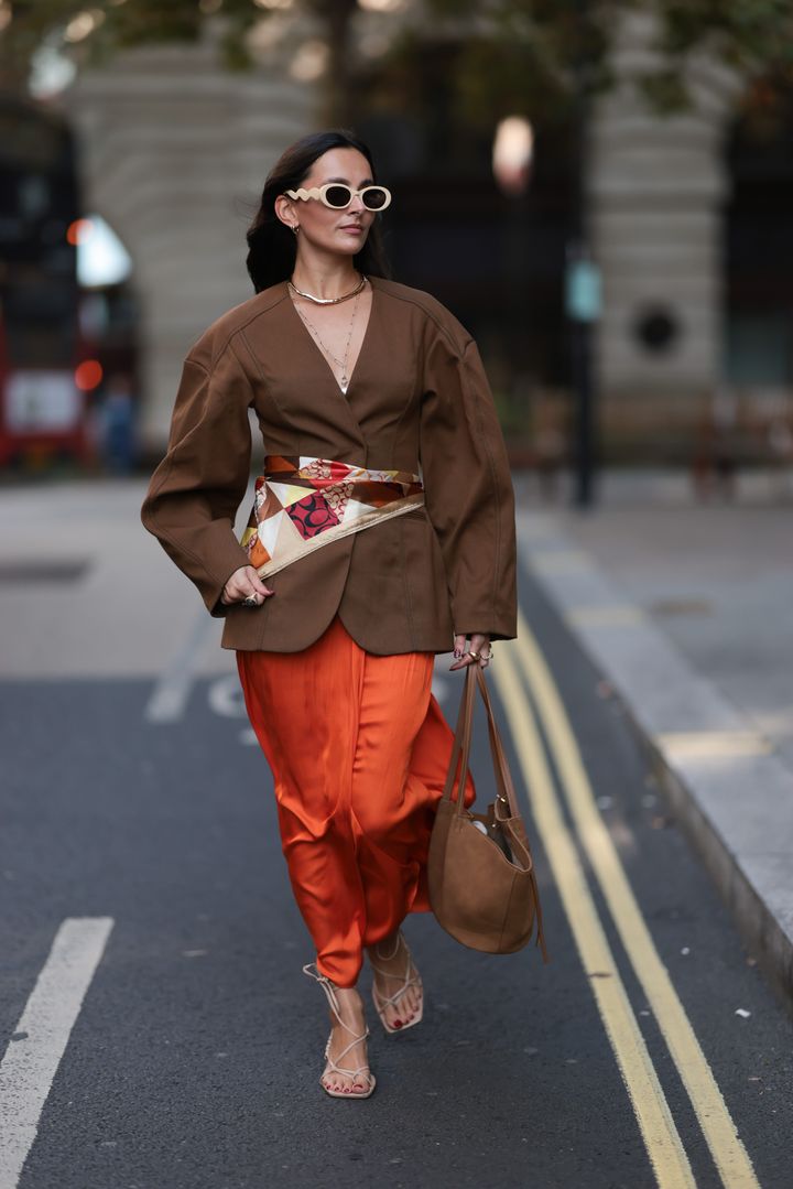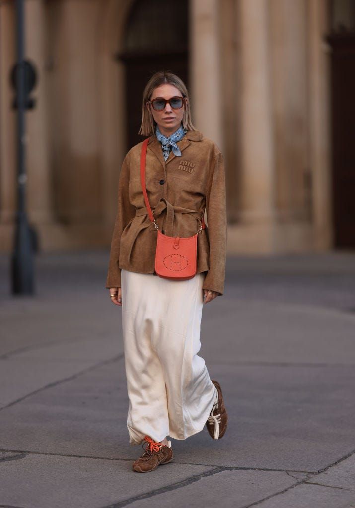 キャメルのジャケットとホワイトのスカートの組み合わせに、エルメスのオレンジバッグをクロスボディにした大人カジュアル。ブラウンのスニーカーには、同じくオレンジのシューレースが新鮮なアクセントに!