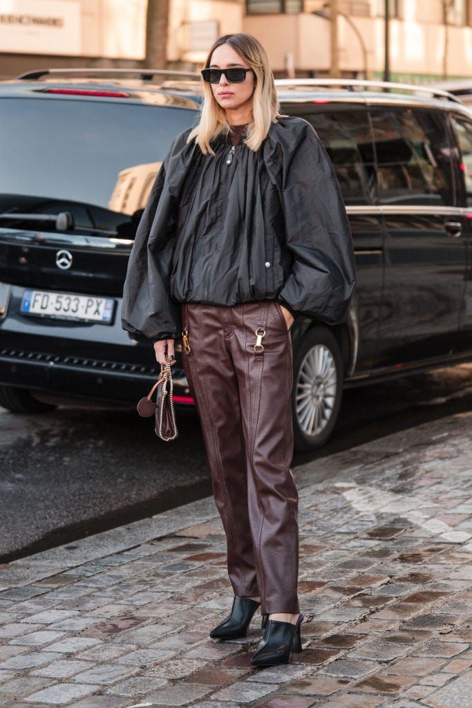 ふんわりとしたブラックのブルゾンにボルドーのレザーパンツを合わせた、シックな着こなし。全体を2色で潔くきめたコーディネートは、素足をのぞかせて抜け感をクリア。明るいヘアカラーが映えて、軽やかに仕上がっています。