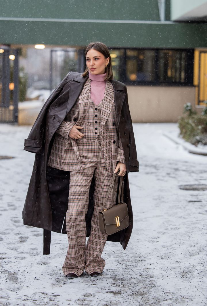 クラシカルな印象のチェック柄ジャケットにブラウンのレギンスを合わせた、軽やかでヘルシーな着こなし。シャネルのバッグもブラウンを選んでこなれ見えを実現。華奢なヒールを合わせてフェミニンに仕上げています。