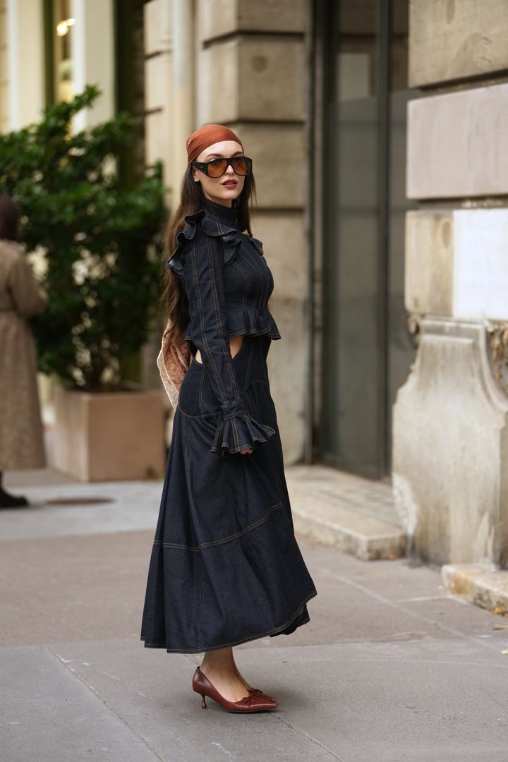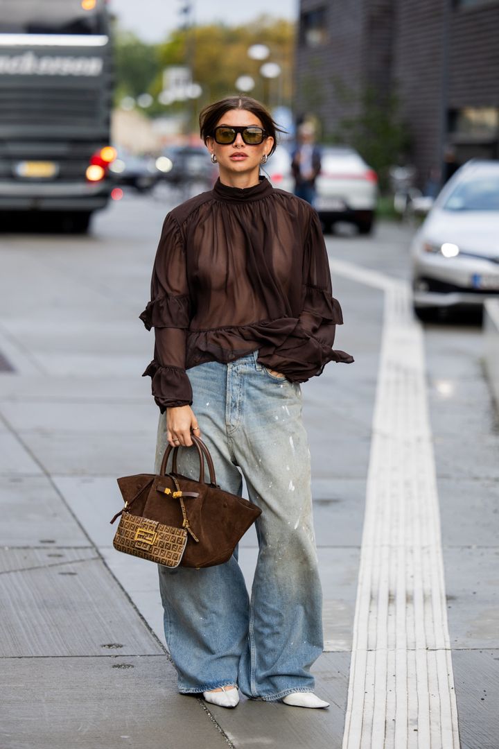 ダークブラウンのアイテムを重ねれば、カジュアルなデニムコーデが一気にリッチな印象に。シアーなブラウスやスムースなスエードバッグなど、素材のメリハリを出したのも着こなしに奥行きが出るポイント。