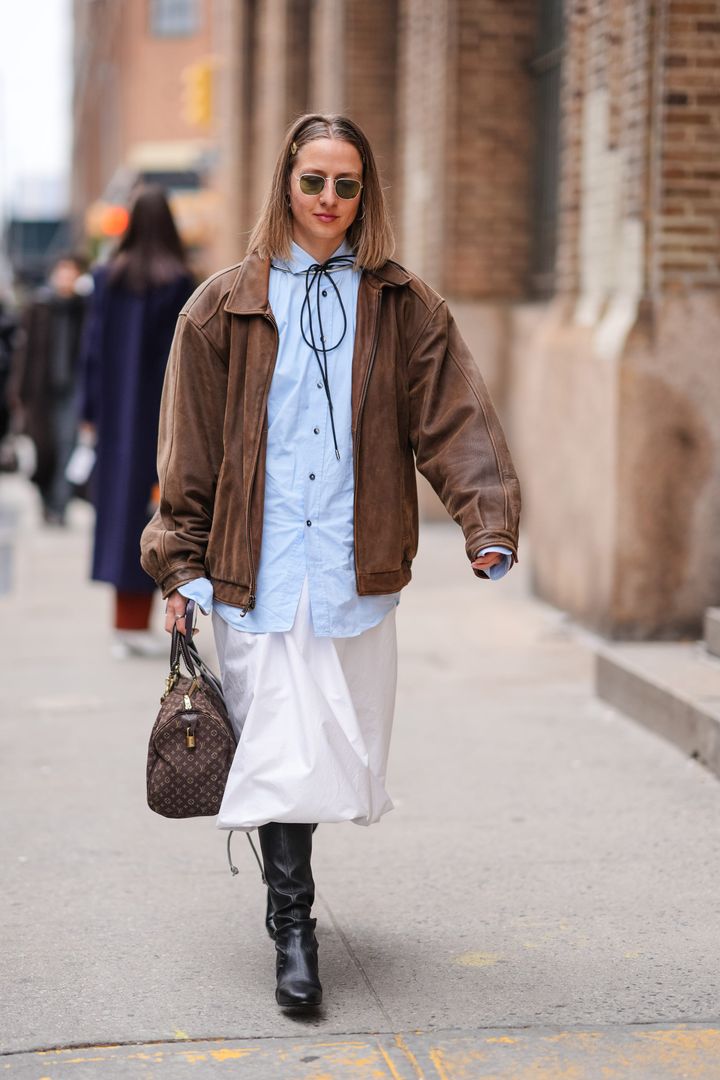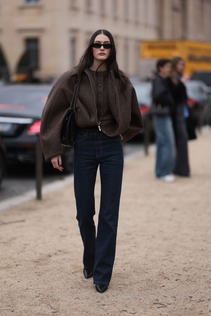 丸みを帯びたユニークなシルエットのブルゾンと、スリムなデニムを合わせた、メリハリのあるスタイルアップコーデを披露。インディゴデニムとシックなブラウンは相性抜群! ポインテッドトゥのシューズでシャープに決めて。