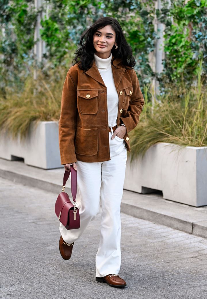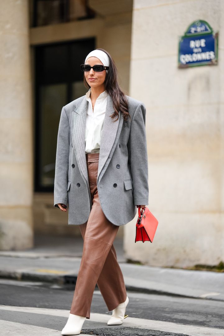 ライトブラウンのレザーパンツと、ライトグレーのジャケットを合わせてエレガントに。洗練されたホワイトのシャツとブーツ、ヘアバンドが見事に調和。ニュアンスカラーだけでなく、バッグに赤を持ってくることで印象的なスタイリングに。