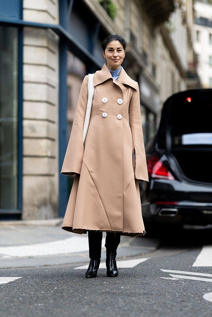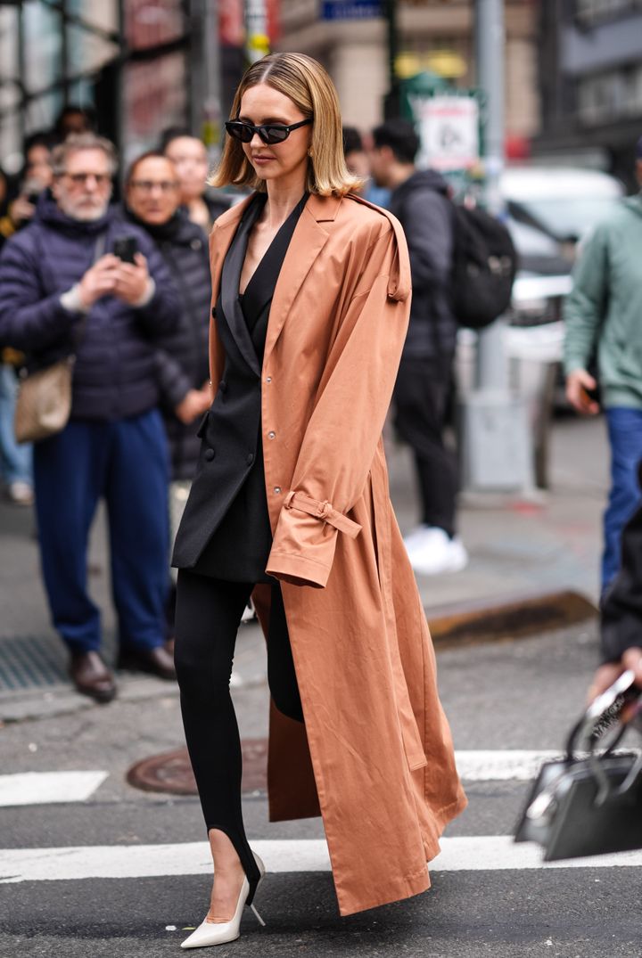 マニッシュなジャケットにレギンスを合わせた、モードかつメリハリのあるコーディネート。赤みを帯びた茶色のロングトレンチを合わせて、軽やかに仕上げて。さらにホワイトのハイヒールを投入してクリーンに。