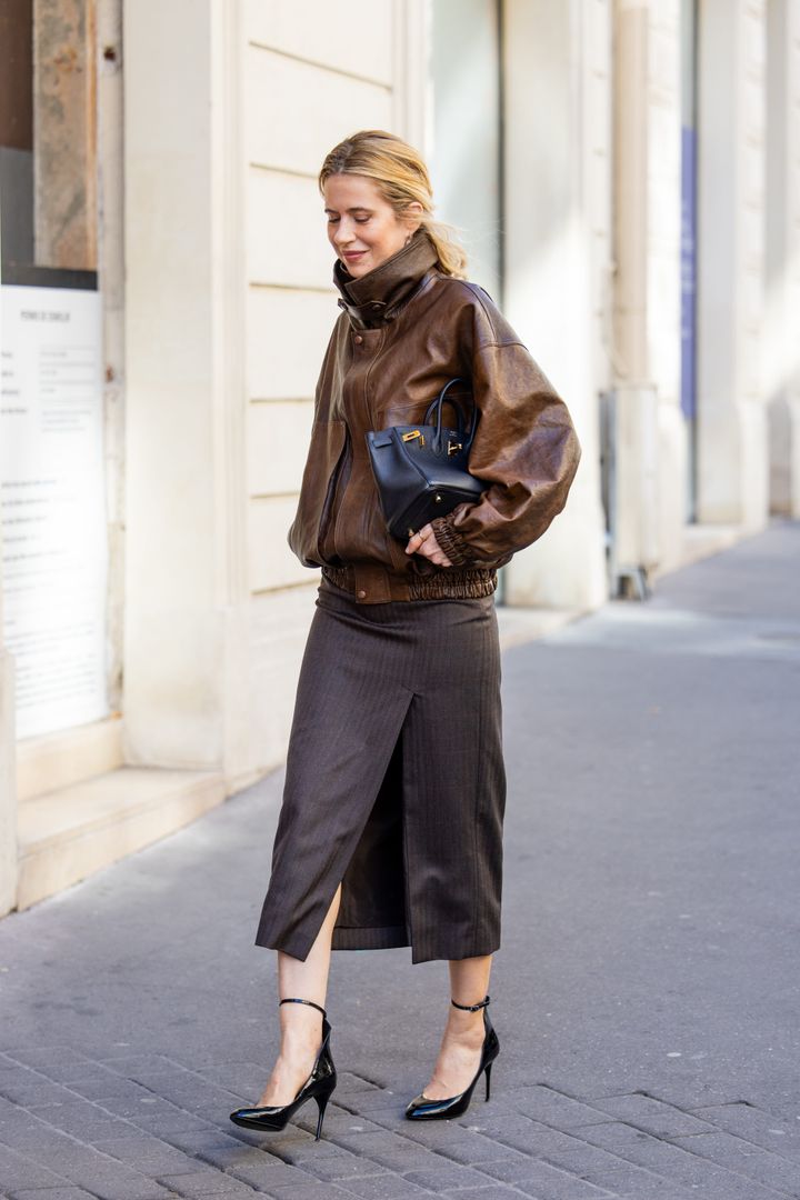 ブラウンのレザーアウター×スカートのモード感が高いスタイリング。モノトーンでまとめがちな着こなしは、オレンジニットをゲームチェンジャーに、ワンランク上のオーラをまとって。