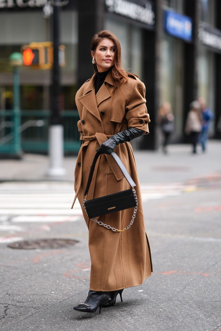 品のいいキャメルのロングコートに身を包み、ブラックのロンググローブ、シューズ、バッグを効果的に使ってオーラたっぷりに仕上げて。大ぶりのイヤリングや、バッグのチェーン、シューズのビジューの輝きもラグジュアリー。