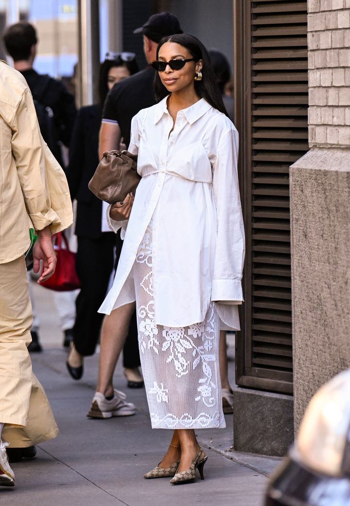ロングシャツとレーシーなドレスをレイヤードした、軽やかでエレガントな春コーデ。バッグは定番の黒ではなく、あえてブラウンを選ぶことで、ぐっとシックで洗練された雰囲気をまとえます。