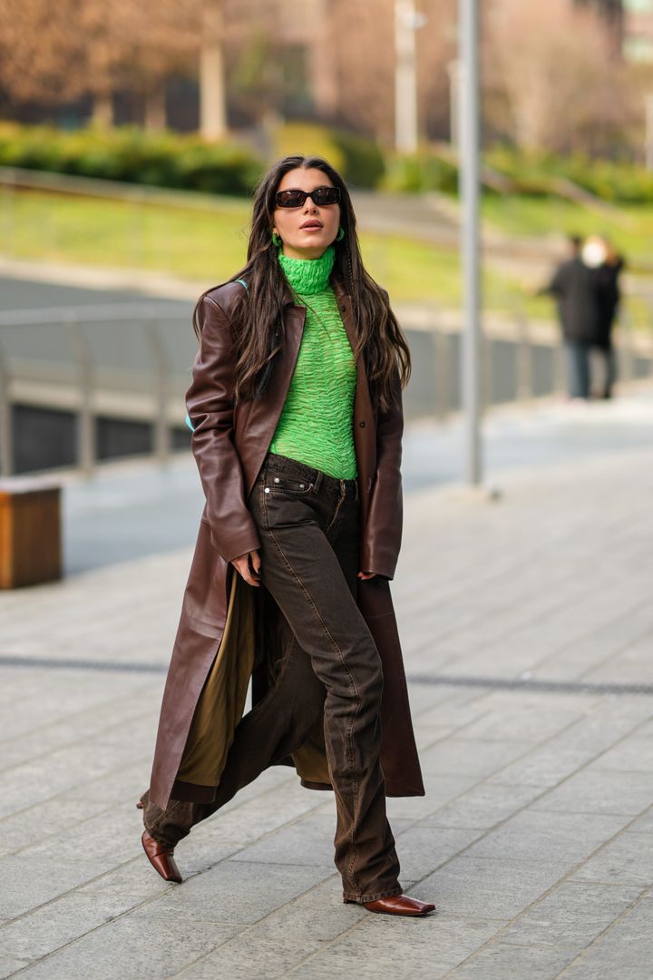 ハードな印象の強いレザーのロングコートは、あえてビビッドなアイテムをぶつけて、上級オーラ漂う着こなしへと昇華するのもあり。パンツやシューズもブラウンでまとめることで、統一感が出て落ち着いた印象もキープ。