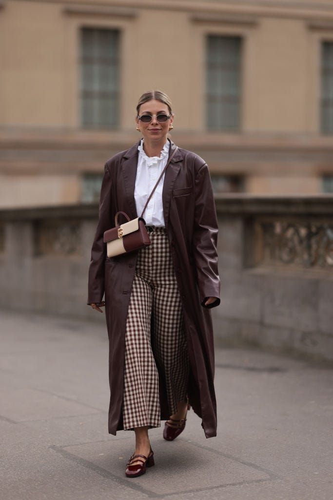 フリルのついたブラウスとホワイト×ブラウンのチェック柄パンツが華やかなコーディネート。同じ配色のバッグがおしゃれ度を加速させて。クールに見えがちな、レザーのロングコートが一気にフェミニンな印象に。