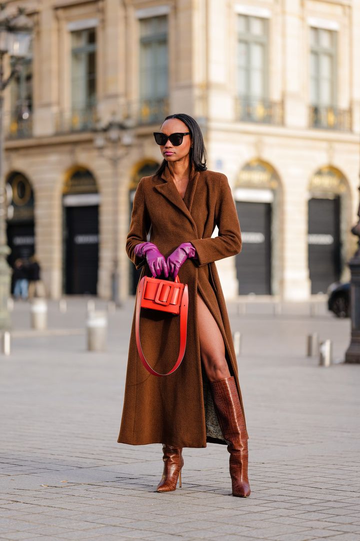 ブラウンのコートで全身を包み込み、コートからのぞく脚元にはロングブーツを合わせることでスタイリッシュに。存在感を放つ、鮮やかなパープルのグローブとオレンジに近いレッドのバッグを合わせて、まさにおしゃれ上級者!