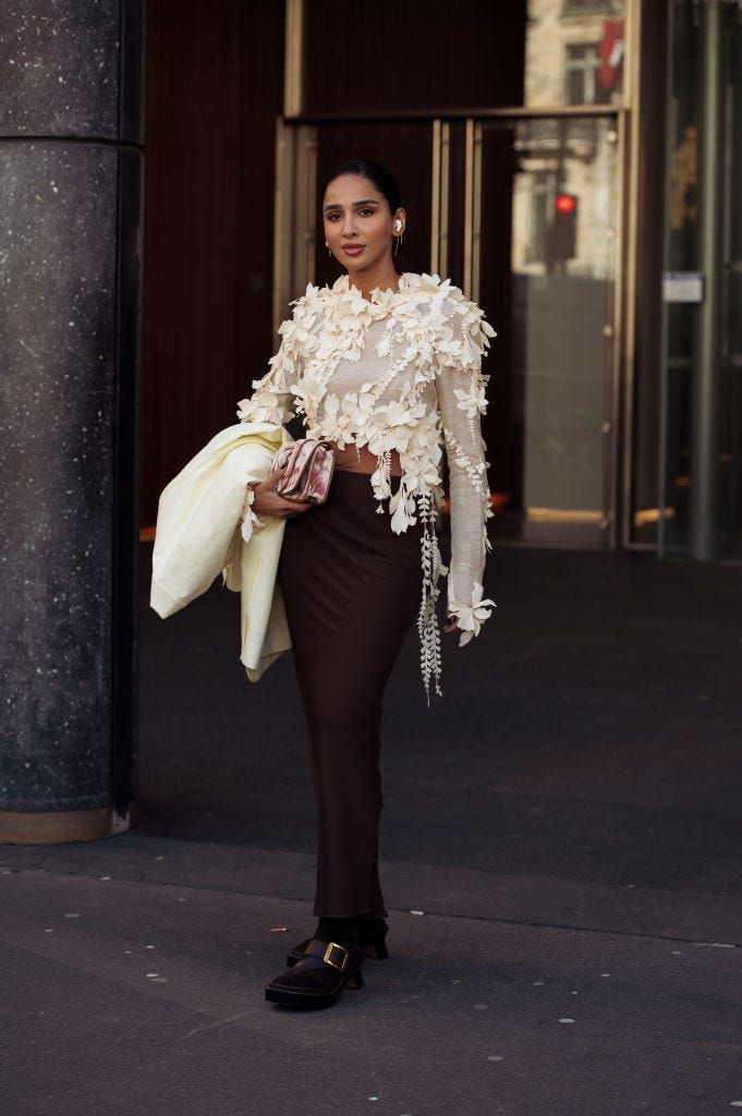 立体的なフラワーモチーフがたっぷりとあしらわれた、ロマンチックなブラウスが主役。ボディラインにフィットするブラウンのスカートは、あくまで引き立て役に。小物もシンプルに仕上げるのがポイント。