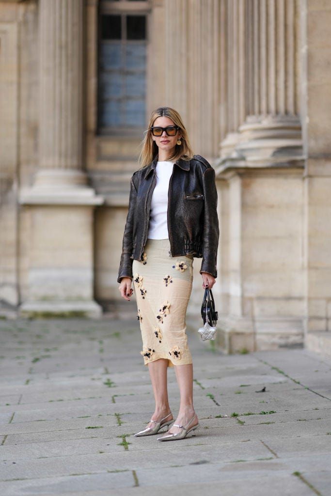 フラワーモチーフがあしらわれたフェミニンなスカートに、ブラウンのレザージャケットを合わせた甘辛ミックス。ベージュの柔らかさが際立つスタイリングは、シルバーのシューズとバッグチャームが軽やかなアクセントに。