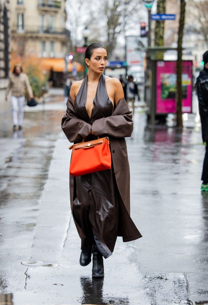 大胆なシルエットのワンピースに、ロングコートを羽織ったセンシュアルな着こなしに、赤いバッグでインパクトをプラス。ビターなブラウンだからこそパキっとした色合いがマッチした、秋冬の街に映えるスタイリング。