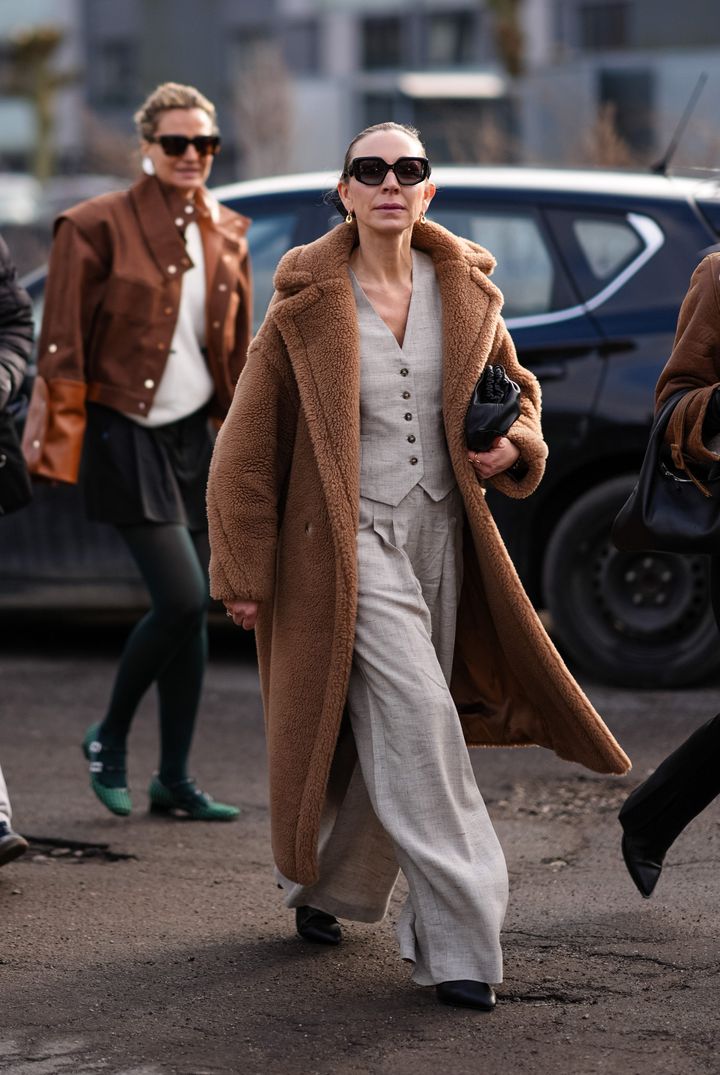 コンパクトなジレとゆったりとしたパンツを合わせたクールな着こなし。テディベアのようなオーバーサイズのボアコートを羽織って優雅な雰囲気に。すっきりとまとめたヘアスタイルと、シャープな胸元が絶妙な抜け感を生んでいます。