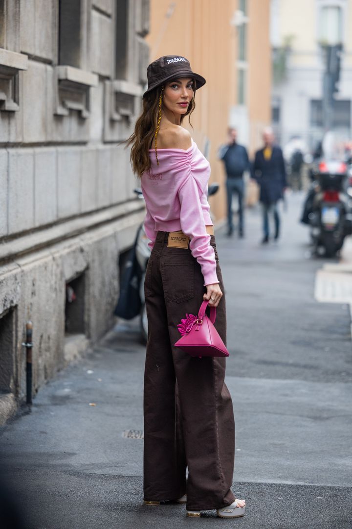 ポップなピンクのオフショルトップをマイルドに受け止めてくれる、ブラウンのワイドパンツが名脇役。ブラウンのハットをのせたり、鮮やかなピンクのバッグを追加するなど、ピンク×ブラウンに徹した着こなしがおしゃれ!