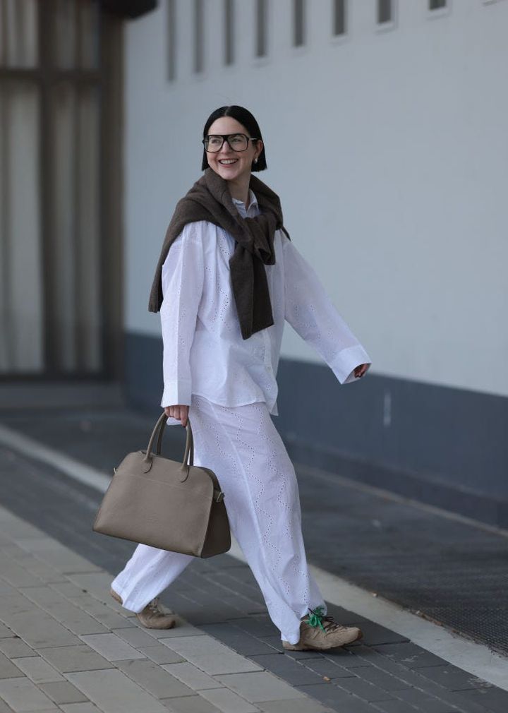 ゆったりとしたホワイトのシャツとパンツのセットアップに、柔らかなブラウンのニットをくるりと肩掛けにして立体感をプラス。淡いグレージュのバッグとシューズで仕上げて、好印象な着こなしの完成です。