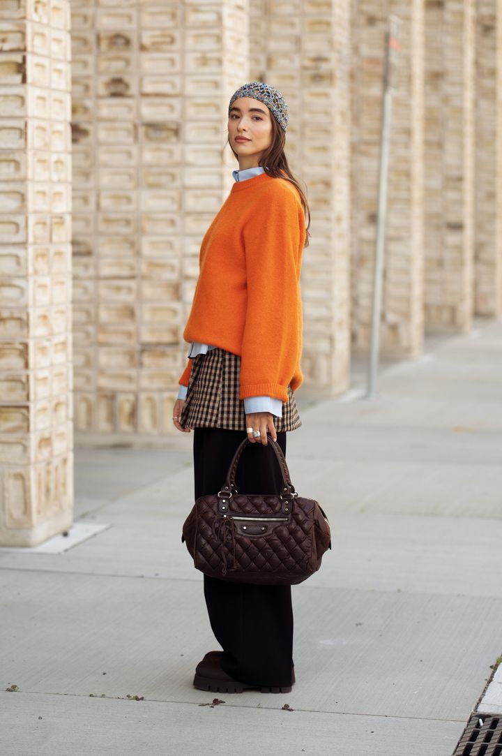 冬のレイヤードにオレンジをプラスすると、温かみと遊び心が加わって◎。シックな受け止め役は、黒ほどコントラストがつきすぎず、ニュアンスをくれるブラウンパンツで決まり。